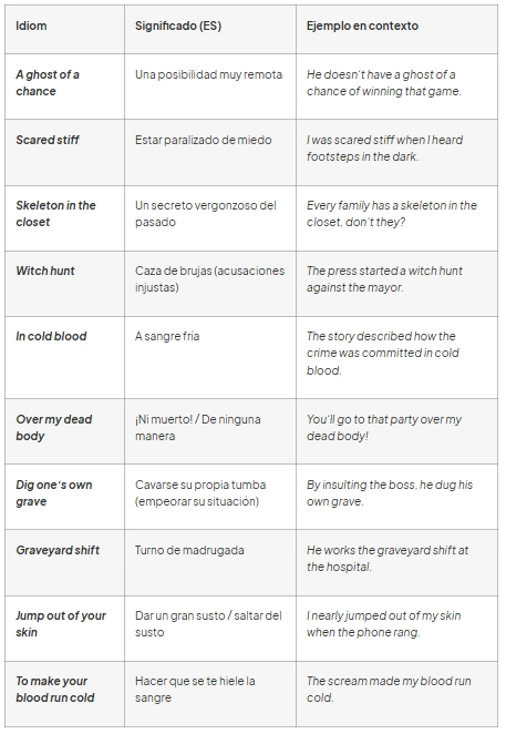 En inglés, existen numerosos idioms que, aunque no están directamente ligados a Halloween, encajan perfectamente en contextos misteriosos, de miedo o de suspense. Son expresiones ideales para enriquecer el vocabulario, mejorar la comprensión y sonar más natural al hablar. Aquí tienes una selección perfecta para usar en Halloween… ¡o en cualquier momento terrorífico!